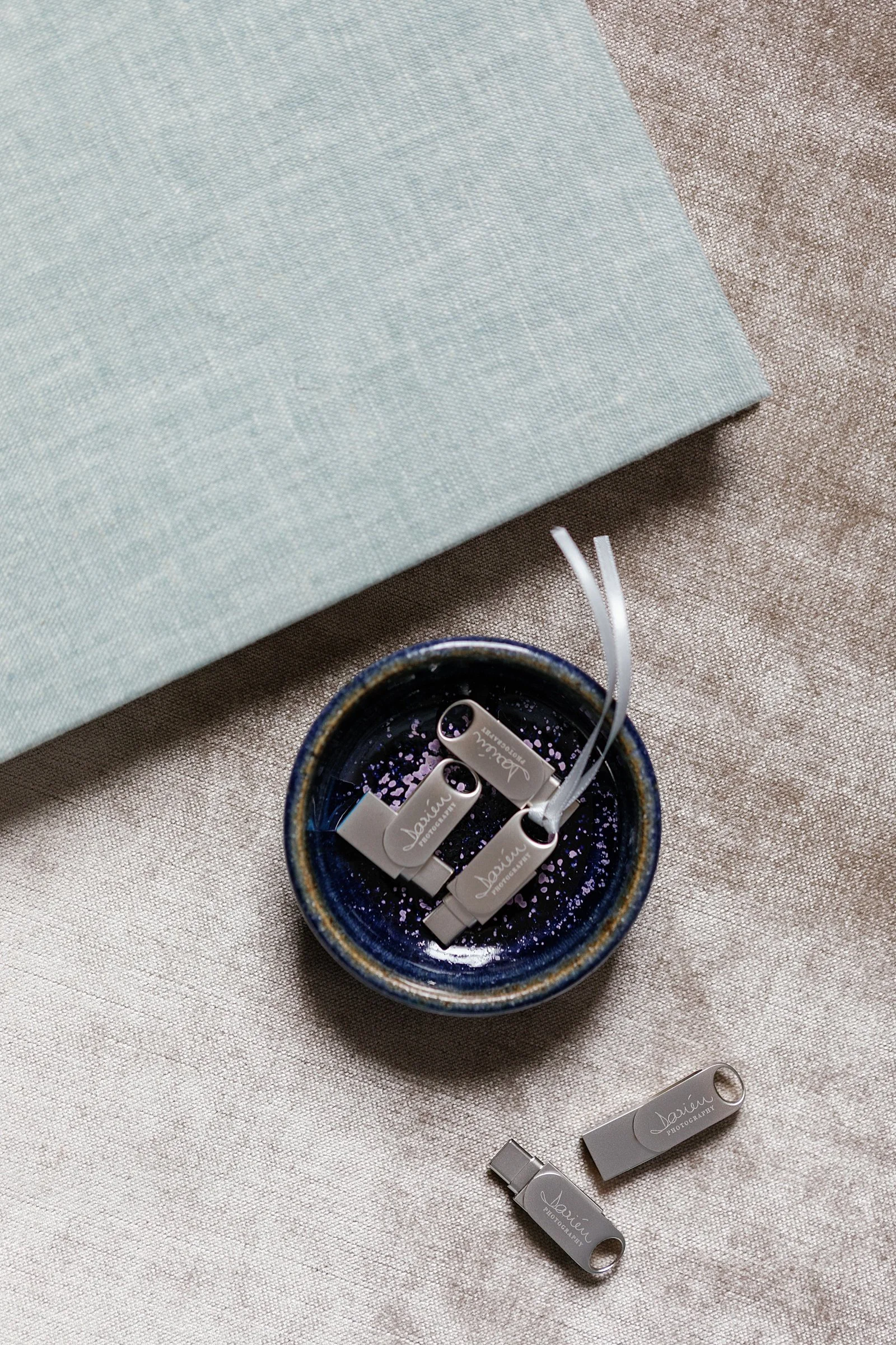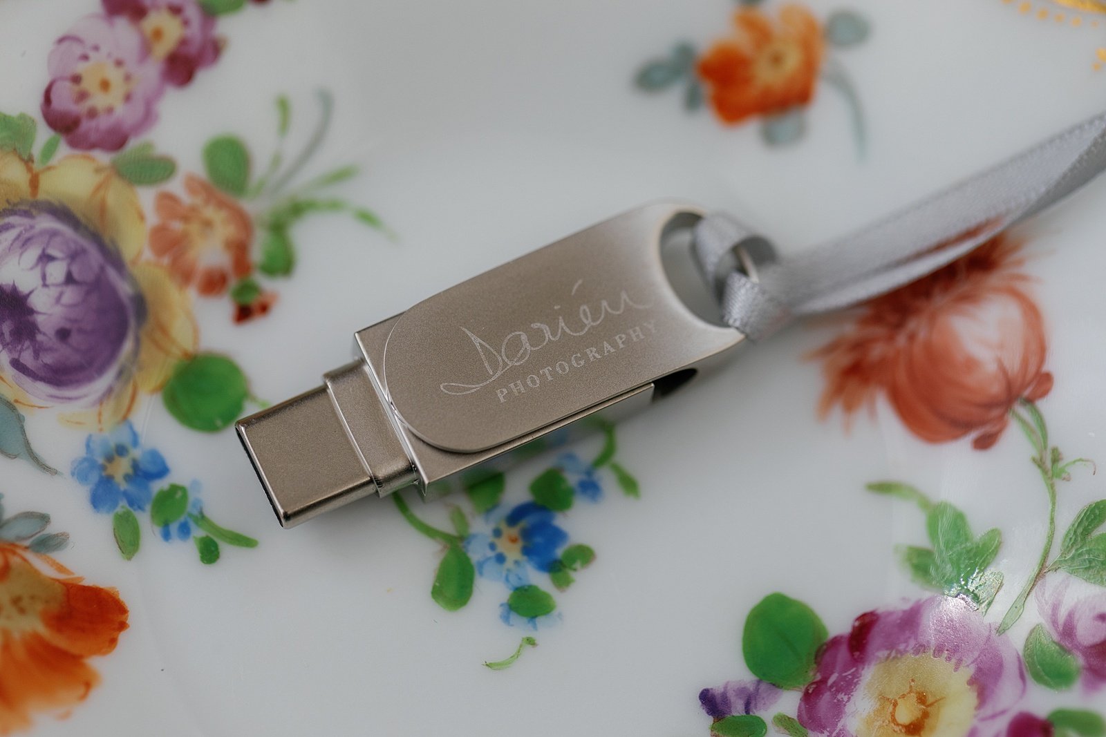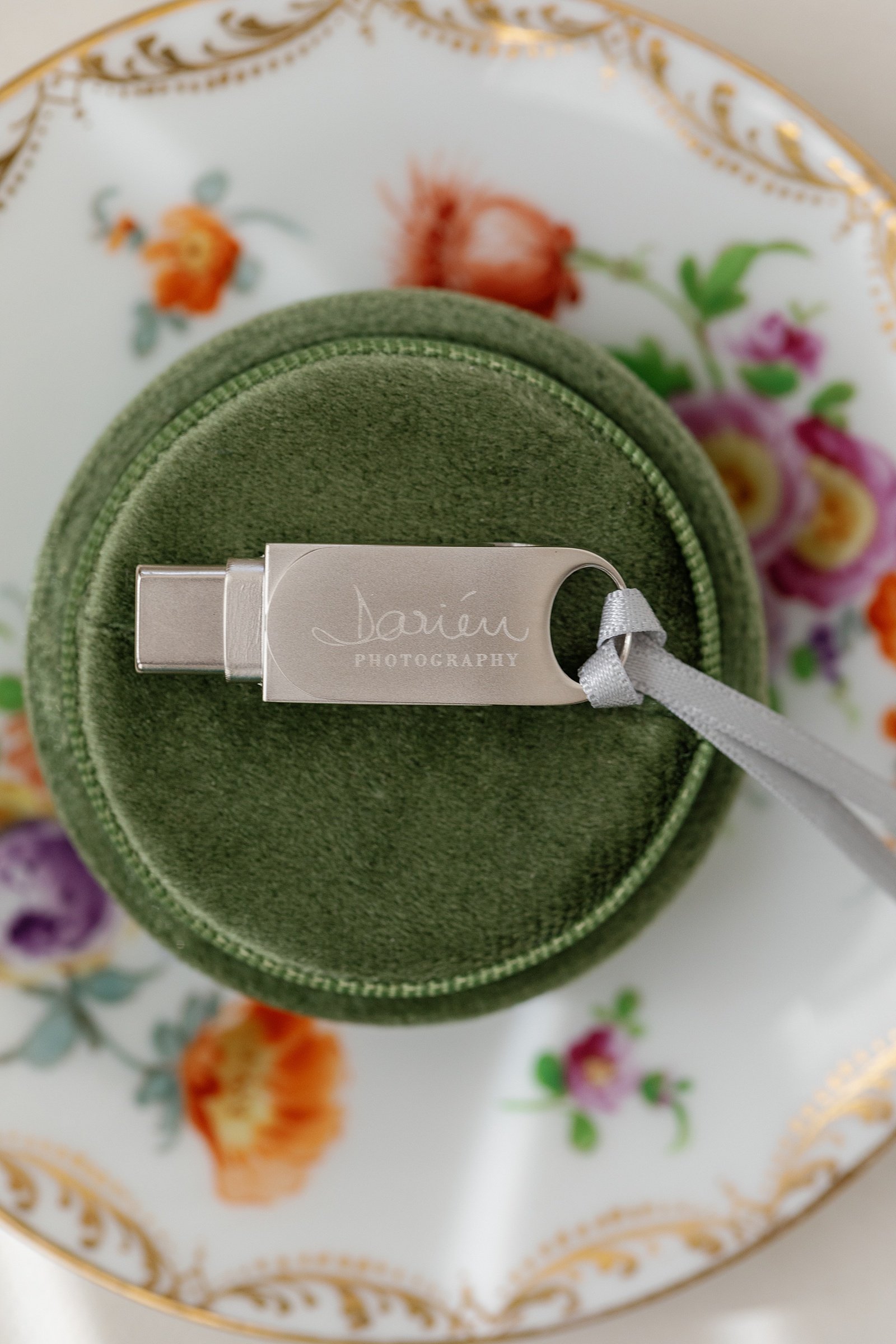 Custom USB Flash Drive branded with Darien Photography’s logo. A perfect gift for wedding clients who want to keep their digital photo files safely backed up and accessible.